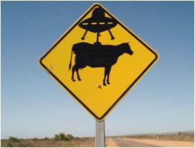 In the Australian outback there are often no fences around homesteads (which can spread over thousands of acres) and sheep and cattle are free to road. Signs are often erected on roads passing through these areas to warn motorists to be on the lookout for the animals. Pranksters have occasionally doctored these signs to give motorists a laugh. The sign below, near Exmouth on North West Cape, Western Australia was quickly taken down by the local shire following a complaint by the homestead owner who may have thought it might encourage further activities detrimental to his livestock. UFOlogists have long believed that the large high powered naval transmitter at the top of the cape attracts alien visitors.