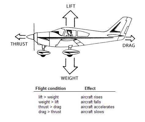 Of course the lift force is not the only force acting on the wing. There is a gravitational force or the weight of the wing, a force which moves the wing through the air due to the engine and a drag force. These are shown for the whole aeroplane below: