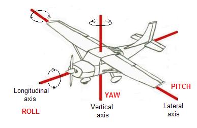 The longitudinal axis runs through the length of the aeroplane and motion about this axis is called ROLL. At right angles to this in the normally horizontal plane is the lateral axis. This goes through the central axis of the wings. Motion about this axis is called PITCH. The final axis is the vertical axis which goes through the center of mass (or gravity) of the plane. Motion about this axis is called YAW.
