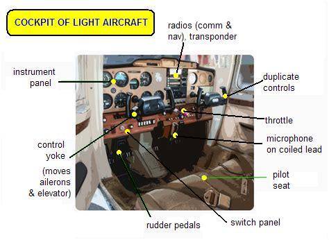 Inside the cockpit are the controls that the pilot uses to move the control surfaces of the aeroplane. A view inside a light aircraft cockpit is shown below.