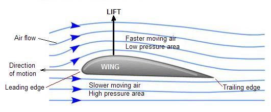 Due to the shape of the wing the air flowing over the top of the wing must move faster to reach the slower moving air on the underside of the wing at the trailing edge. This creates a low pressure area on the top of the wing which gives rise to the upward lift force on the wind.